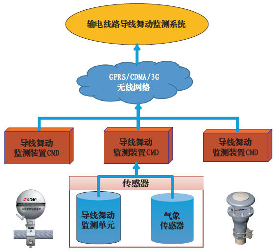 系统简介 输电线路导线舞动监测装置是通过安装于导线上的多个舞动采集单元利用监测三轴加速度和角速率实时测量安装点处导线舞动幅值、频率及气象等数据量,通过后台的专家软件拟合成导线舞动轨迹并预测导线舞动趋势,从而实现了对输电线路上发生的导线舞动实时监测,有效防止混线闪络、金具损坏,造成线路跳闸等重大事故,提高了线路安全运行水平。 系统构成