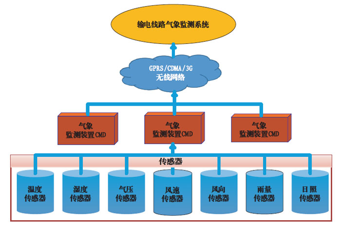 系统简介 输电线路气象在线监测系统通过实时监测输电线路周围的温度、湿度、风速、风向、雨量等参数, 将监测数据, 进行压缩加密处理, 通过GPRS/CDMA/3G/OPGW光纤等网络传输到监测中心,监测中心专家软件对数据进行综合分析,将所有数据通过各种报表、统计图、曲线等方式展示给用户。当现场数据达到用户设定预警数值时,系统启动声、光报警;同时将报警信息以短信方式发往有关人员的手机上,以提醒用户采取相关应对措施。长期运行时,可采集、存储大量的气象数据,为线路的规划设计及状态检修的实施提供依据。 系统构成