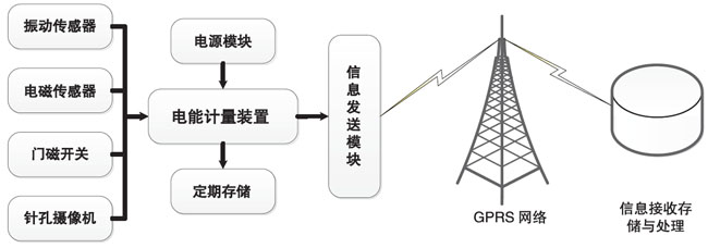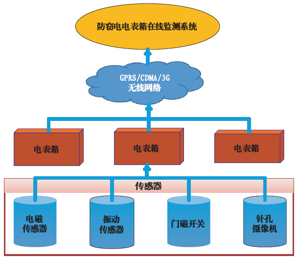 系统简介 防窃电电表箱在线监测系统采用新型物联网技术和GPRS通信技术,采集电表箱各个部位的振动、电磁干扰及表箱门的非法打开等信息,一旦发现异常,系统发出警示并采集现场图片,并将信息传至主站及相关管理人员手机,以便及时有效阻止窃电行为。通过此装置能实现对不法分子通过改变电能计量装置内部结构及用电磁场干扰电能计量装置进行偷窃电的行为自动留取证据,为供电企业和公安机关打击偷窃电提供证据。 系统构成